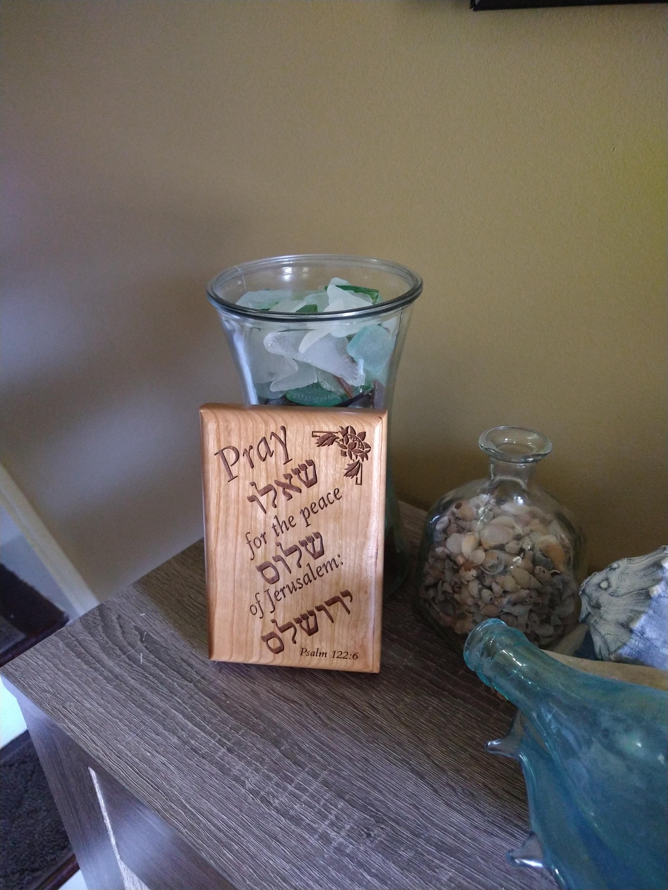 Pray for the peace of Jerusalem Christian, Hebraic, Messianic wall art in cherry, alder, or maple wood captures a simple message, ever so timely for our world today. Engraved with beauty and precision on your choice of cherry, maple or alder woods, this exquisite wall hanging measures 4 inches wide by 6 inches high. This timely Biblical message will add beauty and warmth to your home, office or church decor while gently reminding us to pray for the peace of Jerusalem. Add a custom personalized message at no added charge, on the back for that special gift for that special someone.